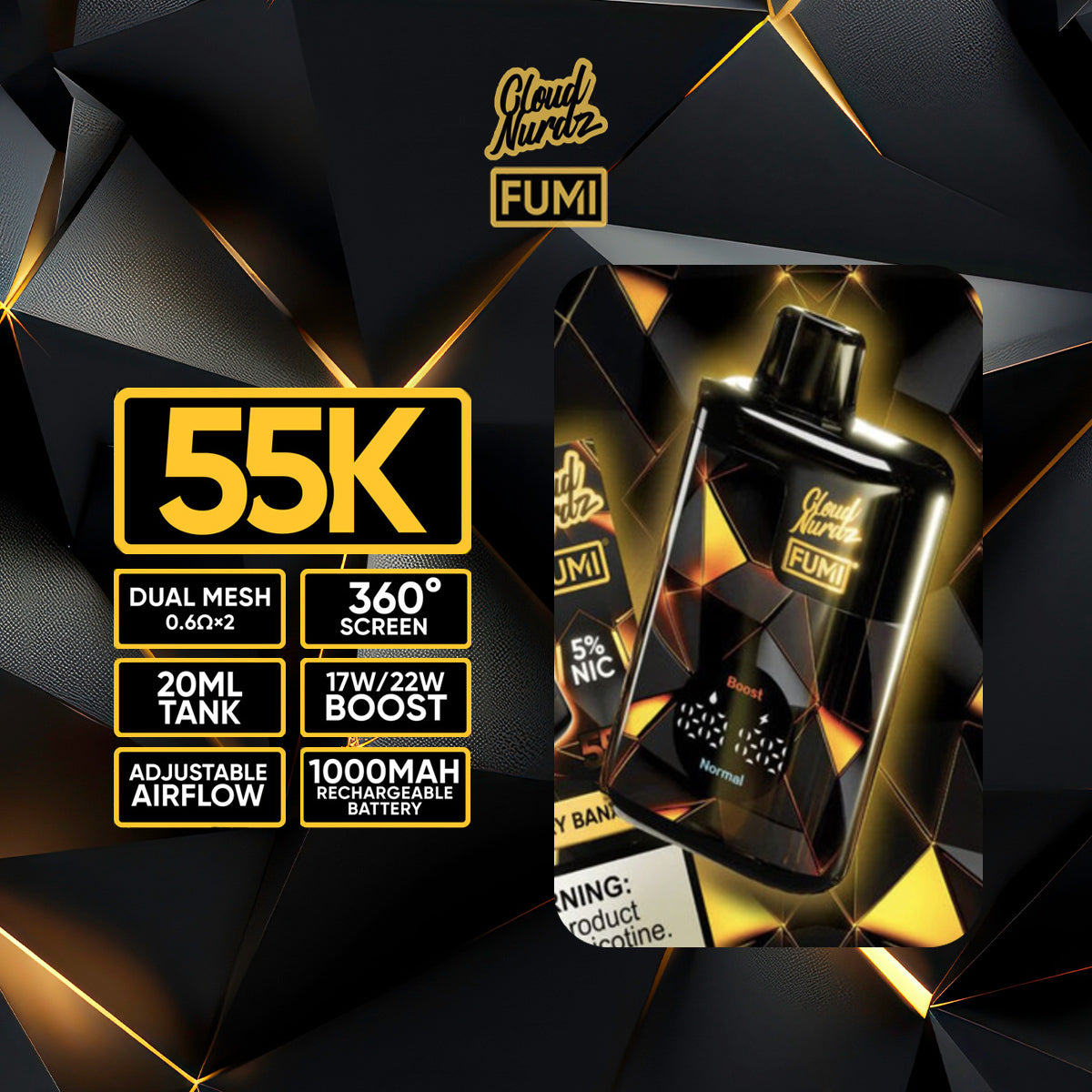 The Fumi x Cloud Nurdz 55K Disposable Vape combines Fumi’s advanced hardware with Cloud Nurdz’s sweet, signature flavors in a sleek, high-capacity device. Featuring a 20mL e-liquid reservoir and a rechargeable 1000mAh battery, it’s designed for where life takes you. The modern black-and-gold shell delivers a low-key look without flashy lights, while the smart digital display keeps you updated on battery life, e-liquid levels, and vaping modes in real time.Feature-Packed: