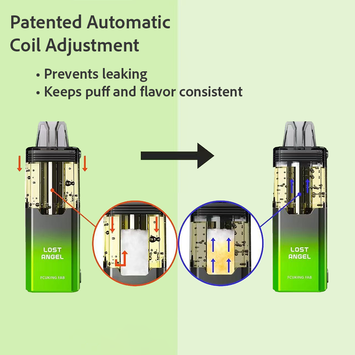 - Patented Coil Adjustment: Internal coil shifts with e-liquid levels to prevent leaks and deliver consistent flavor.