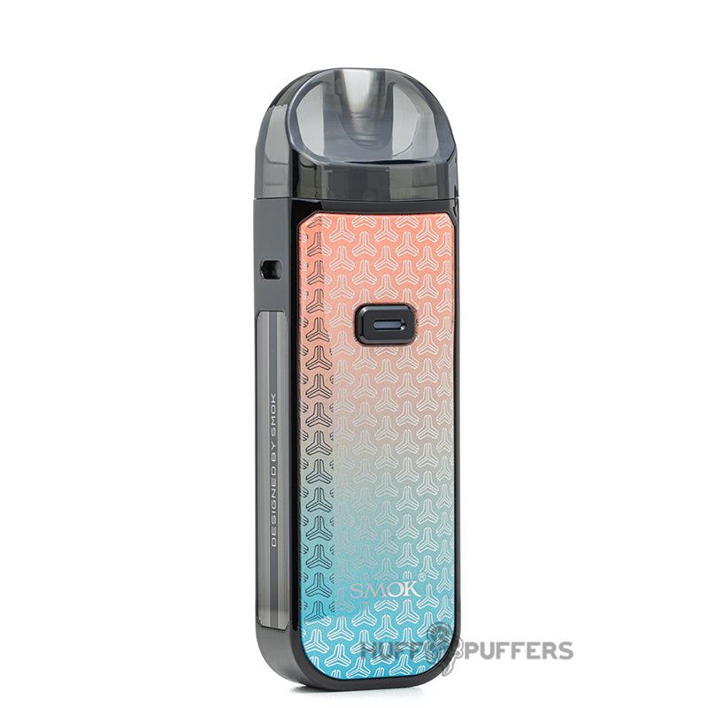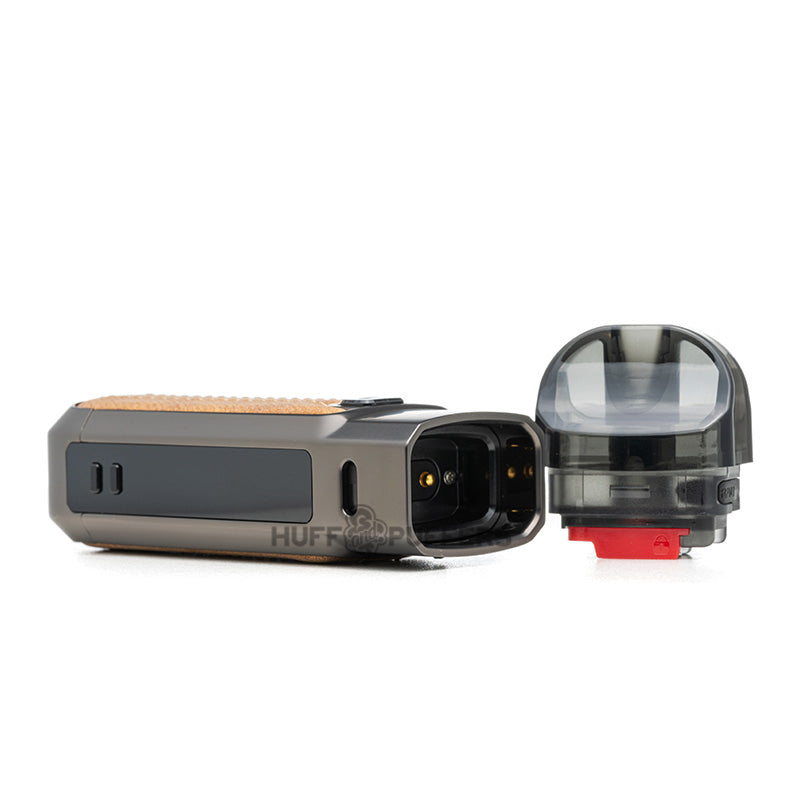 The Smok Nord 5 Pod System is an 80 watt vape device that uses an internal 2000 mAh rechargeable battery. The mod is constructed out of a zinc alloy chassis, comes in a Dart or Leather version, and uses a refillable pod that has a 5.0 mL e-liquid capacity. Users can also adjust airflow via the sliding lever, and it features a 0.69 inch OLED screen for displaying vaping parameters. The pod also features a sliding lock system which helps prevent leaking and securely holds the press-fitted coil in place.