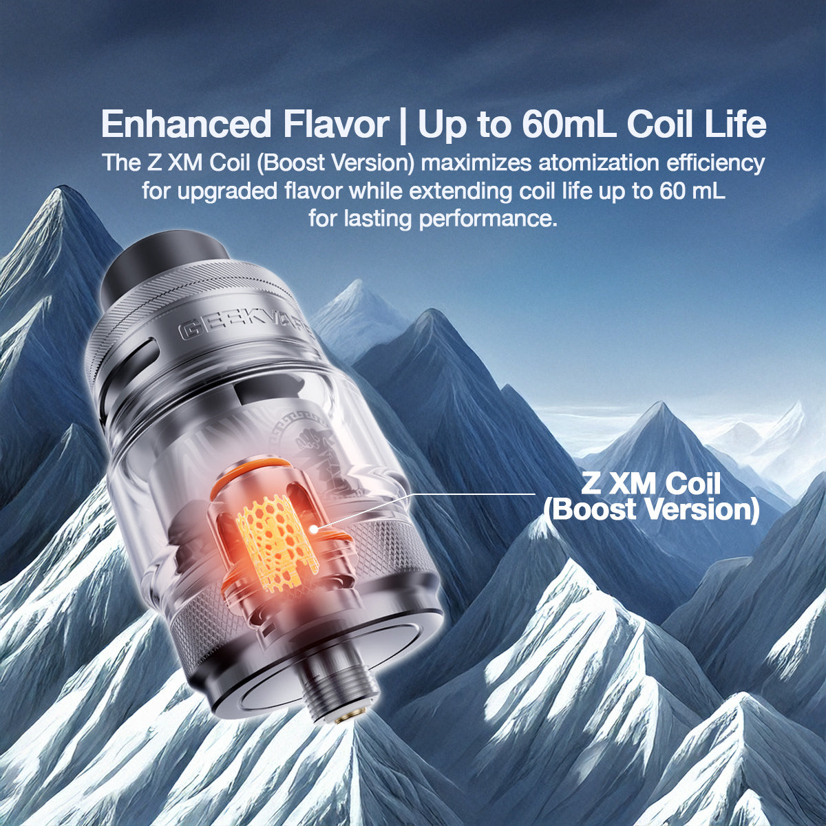 Built on the trusted Geekvape Z Series Coil platform, the Z Tank 5 keeps full compatibility with the wide range of Z Series coil resistances, allowing you to customize your vape from warmer, high wattage clouds to a smoother, more balanced draw. Included with the tank is the upgraded Z XM Boost Version coil, engineered for richer flavor, faster ramp up, and dense vapor production. With an impressive 60mL coil lifespan that is double the amount of previous versions, you get longer lasting performance and fewer coil changes without sacrificing flavor.